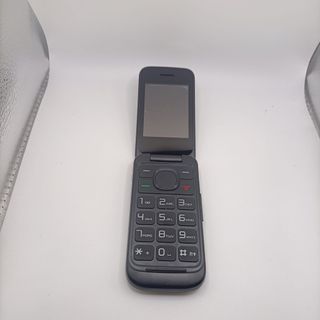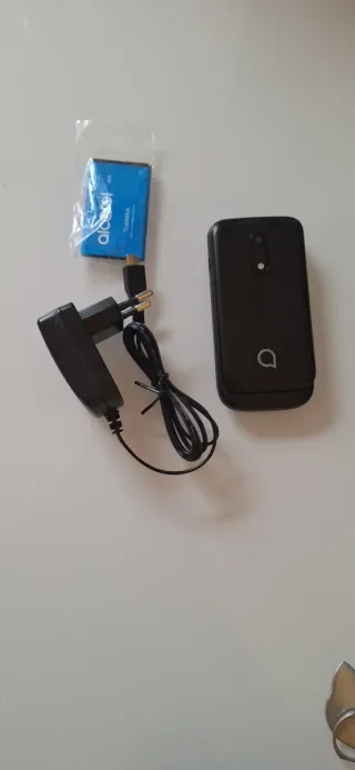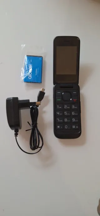 Telefono cellulare basico Alcatel in colore nero. Un dispositivo semplice e funzionale. - Design pieghevole. - Tastiera numerica. - Schermo a colori. Piccolo graffio in un angolo. Funziona perfettamente. Include caricabatterie.