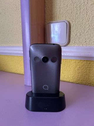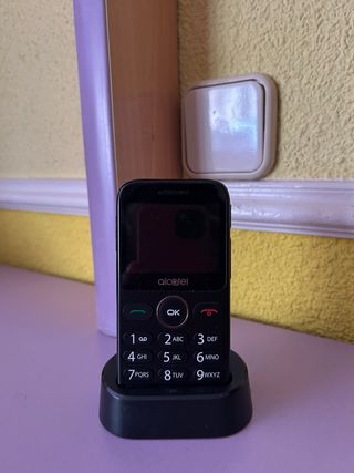 Telefono mobile Alcatel progettato per gli anziani, con funzioni pensate per una facile usabilità. - Schermo con icone grandi. - Tasti di composizione rapida. - Base di ricarica. - Funzione di assistenza di emergenza (SOS).