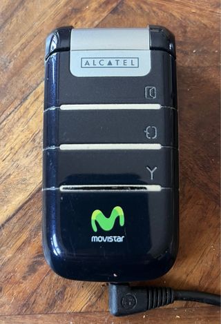 Telefono mobile Alcatel della compagnia Movistar. Colore blu e argento.