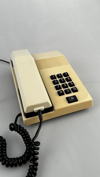 Telefono modello Teide D+R di Alcatel per Telefonica, anni '80. Tastiera numerica originale con tasto R. Conserva etichette e numerazione interna di installazione (vedi foto). Colore beige originale con ingiallimento naturale del tempo. Presenta segni e usura tipici della sua età, senza rotture strutturali. Cavo a spirale originale e base in buone condizioni. Modello iconico della telefonia spagnola degli anni '80. Ideale per decorazione retrò, scenografia, collezionismo o interior design con estetica anni '80. Spedito ben protetto.