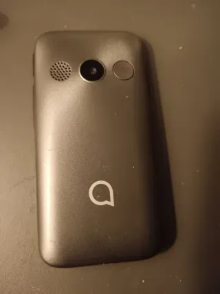 Telefono mobile classico della marca Alcatel, in colore grigio e con logo Movistar. Design a conchiglia (flip). Tastiera numerica. Schermo a colori. Carica e accendi, non so altro.