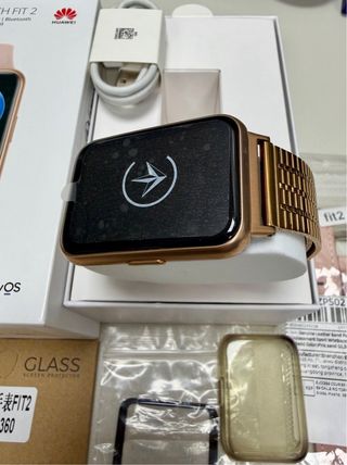 Smartband Huawei Watch Fit 2 in colore oro rosa. Include cinturino di ricambio in pelle rosa e un altro con anelli del colore del quadrante. Usata ma in buone condizioni. - Durata della batteria di circa 1 settimana o più. - Schermo FullView da 1,74 pollici. - Connettività Bluetooth. - Gestione della vita sana. - Vari proteggi schermo.