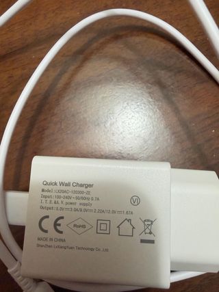 Caricabatterie da muro Huawei Quick Wall Charger. - Modello: HW-200200C02 - Input: 100-240V~50/60Hz 0.7A - Output: 5V/2A o 9V/2A o 10V/2.25A o 5V/4.5A o 4.5V/5A - Made in China - Shenzhen Honor Technology Co., Ltd.
