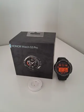Smartwatch Honor Watch GS Pro in nero e arancione. Include il suo caricabatterie. È un orologio intelligente molto completo con un eccellente rapporto qualità-prezzo. Design sportivo e robusto. Schermo circolare. Cinturino in silicone. Connessione con il cellulare tramite Bluetooth. Funziona con l'app Salute di Huawei. Otturatore per foto a distanza. Piani di allenamento sportivo. Schermo AMOLED molto resistente. Viene fornito con il caricabatterie, le istruzioni e la sua scatola originale.