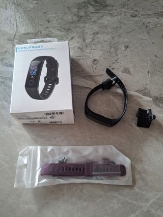 Bracciale conta passi Honor Band 5 compatibile con telefoni Huawei. Perfettamente funzionante con carica batterie originale e cinturino nuovo color viola. Lo vendo per cambio cellulare.