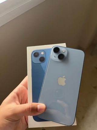 Telefono cellulare iPhone 13 in colore blu. Design elegante e moderno. Doppia fotocamera sul retro.