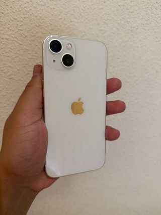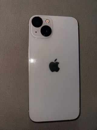 Telefono mobile Apple iPhone 13 in colore bianco. - Schermo da 6,1 pollici. - Sistema di fotocamera dual avanzato. - Chip A15 Bionic. - La fotocamera posteriore non funziona, rimane bloccata. - Face ID non funziona.