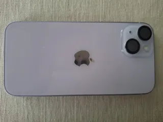 Telefono cellulare iPhone 14 ricondizionato con finitura viola e dettagli argentati. Design elegante e moderno. Fotocamera doppia sul retro.