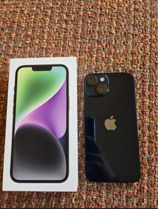 Telefono cellulare iPhone 14 in colore blu marino. Ha un anno e il 90% di salute della batteria.