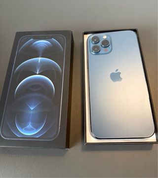 Telefono cellulare iPhone 12 Pro Max in colore blu. 77% di batteria. - Schermo da 6,7 pollici. - Sistema a tripla fotocamera. - Finitura opaca.