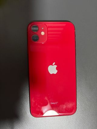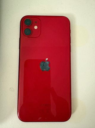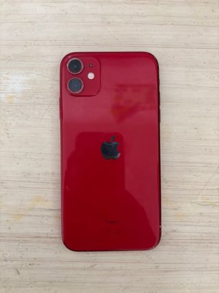 Telefono cellulare iPhone 11 in colore rosso. Capacità di archiviazione di 64 GB. Batteria leggermente usurata ma ancora in uso.