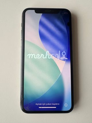Telefono cellulare iPhone 11 in colore nero. - Schermo con gradiente di colori. - Messaggio di benvenuto 'hel'.