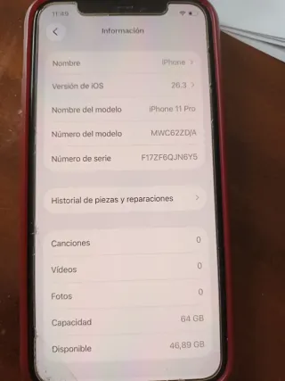 iPhone 11 Pro con 64 GB di spazio di archiviazione. - Modello: MWC62ZD/A - Numero di serie: F17ZF6QJN6Y5 - Capacità totale: 64 GB - Spazio disponibile: 46,89 GB