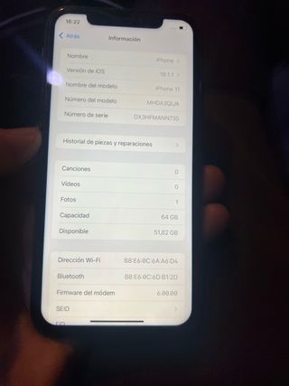 In vendita iPhone 11 con 64GB di capacità. - Modello: iPhone 11 - Capacità: 64 GB - Versione iOS: 18.1.1 - Numero di serie: DX3HFMANN735 - Indirizzo Wi-Fi: B8:E6:0C:6A:A6:D4 - Bluetooth: B8:E6:0C:6D:B1:2D - Firmware del modem: 6.00.00