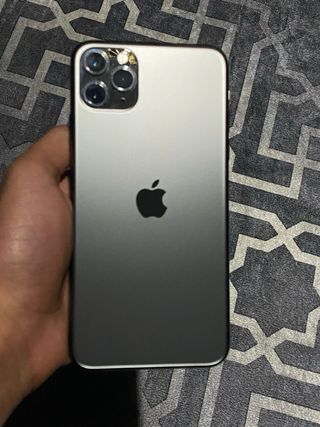 iPhone 11 Pro Max in colore grigio/verde notte. Lo schermo è rotto. Tripla fotocamera. Logo Apple sul retro.