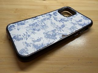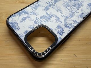 Custodia per iPhone 11 Pro del marchio Casetify. Design stampato blu e bianco. Bordo nero.