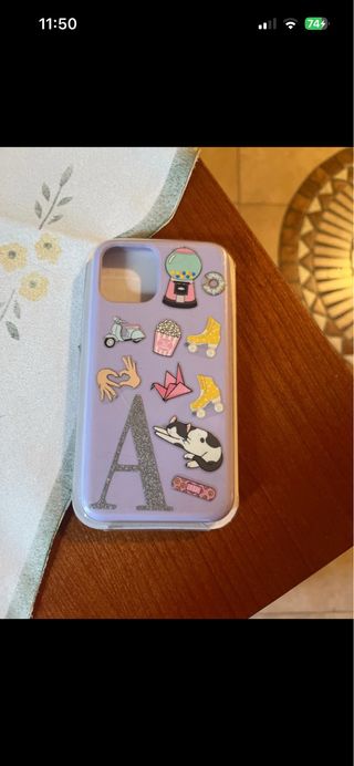 Cover per iPhone 11 Pro con simpatici adesivi decorativi. - Design viola con adesivi a tema: gumball machine, scooter, popcorn, pattini, origami, gatto, skateboard, mano e ciambella. - Lettera 'A' glitterata al centro.