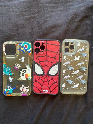 Set di tre cover per iPhone 11 Pro con design vari. - Cover trasparente con personaggi di Shin Chan. - Cover rossa con design Spiderman (Marvel). - Cover trasparente con stampa di squali. 2€ ciascuna o tutte e 3 per 5€