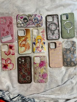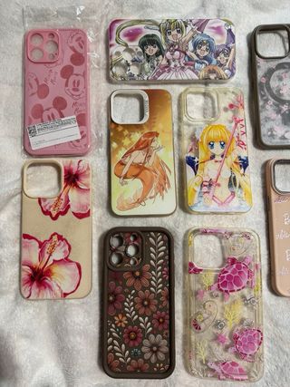 Set di 11 custodie per iPhone 15 Pro Max con vari design. Alcune nuove o poco usate + vetro protettivo - Custodia rosa con stampa di Topolino. - Custodia con design anime. - Custodia con fiori rosa e foglie. - Custodia con design sirena. - Custodia con personaggio anime biondo. - Custodia con stampa floreale in toni marroni. - Custodia trasparente con tartarughe marine e stelle marine. - Custodia con stampa di fiori rosa. - Custodia con stampa di orsetti. - Custodia verde brillante con anello magnetico. - Custodia grigia con stampa floreale e anello magnetico.