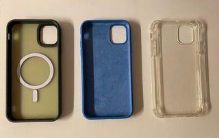 Set di tre custodie per iPhone 11. - Custodia trasparente con protezione. - Custodia in silicone blu. - Custodia verde traslucida con MagSafe.