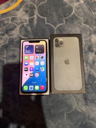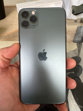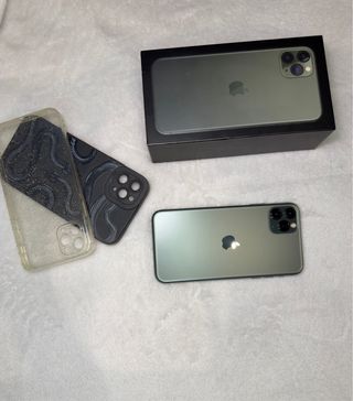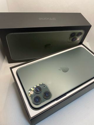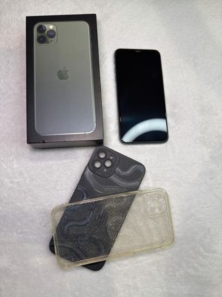 Telefono cellulare iPhone 11 Pro Max in colore verde notte. In perfette condizioni, mai aperto, tutto originale e sempre con protezione. Libero da iCloud. Nella sua scatola senza caricatore, solo auricolari originali e con tutte le custodie della foto. Schermo Super Retina XDR. Sistema a tripla fotocamera. Chip A13 Bionic.