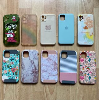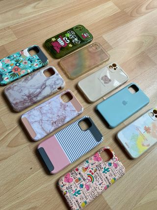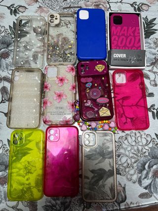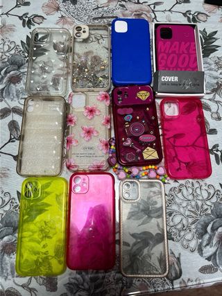 Set di cover per iPhone 11 con diversi design e finiture. Set di 11 cover a 30€ e ogni cover a 3€ - Cover trasparente con cuori bianchi. - Cover trasparente con glitter. - Cover blu. - Cover rosa con scritta MAKE GOOD THINGS. - Cover trasparente con design floreale. - Cover trasparente con scritta CUTIE. - Cover viola con disegni. - Cover rosa brillante. - Cover verde lime con design floreale. - Cover viola brillante. - Cover trasparente con design floreale scuro.