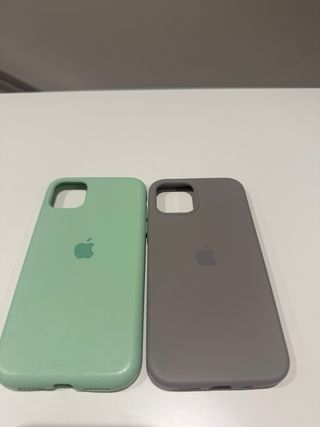Due cover protettive per iPhone 11 e iPhone 12. Una in colore menta e l'altra in grigio. Materiale in silicone. Logo Apple inciso. La cover marrone è per iPhone 12 e quella verde per iPhone 11.