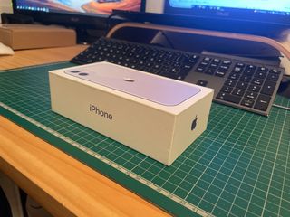Scatola originale per iPhone 11. Colore viola. Design con doppia fotocamera.