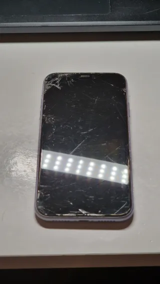 Telefono cellulare iPhone 11 in colore nero. Ha due righe viola sullo schermo ma funziona perfettamente e i cristalli sono perfetti