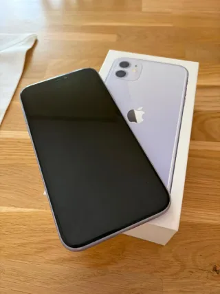 Telefono cellulare iPhone 11 con finitura viola e 128GB di spazio di archiviazione. - Schermo da 6,1 pollici. - Chip A13 Bionic. - Sistema a doppia fotocamera. - Resistente all'acqua e alla polvere. In ottime condizioni. 86% di batteria. Regalo con custodia protettiva. Con cavo e scatola.