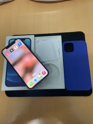 Telefono cellulare iPhone 12 con finitura blu e 128GB di spazio di archiviazione. Include custodia protettiva rossa. Scatola originale.