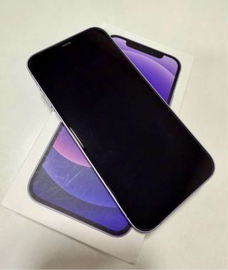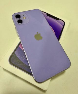 Telefono cellulare iPhone 12 con finitura viola. Capacità di archiviazione 128GB. Salute della batteria 74%. Senza segni di utilizzo.