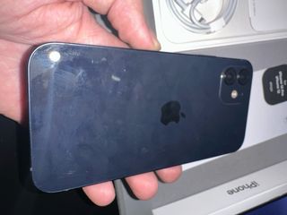 Telefono cellulare iPhone 12 con finitura blu marina. Fotocamera x1 rotta, fotocamera x0.5 funziona perfettamente. Il microfono dell'altoparlante non funziona, quello per le chiamate sì. Batteria all'81%.