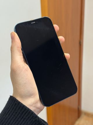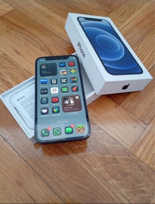 Telefono cellulare iPhone 12 in colore blu scuro con 64GB di spazio di archiviazione. Design elegante e moderno. Schermo nitido e vibrante. Batteria al 77%. Tutti i componenti originali, nessuno sostituito. Fornito con cavo lightning e custodia. Presenta un paio di piccole imperfezioni sul telaio dovute all'uso. Puramente estetico.