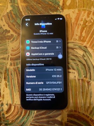 Vendo iPhone 12 mini, un dispositivo elegante y potente. dotato di una cover - Modello: iPhone 12 mini - Versione iOS: 26.2 - Numero di serie: QP2V5MJF9Y - IMEI: 35 284942 0741211