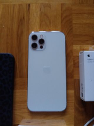 Telefono cellulare iPhone 12 Pro Max con 128GB di spazio di archiviazione. Batteria al 74% in ottime condizioni, dura come nuova. Colore argento. Include vari accessori per il telefono.