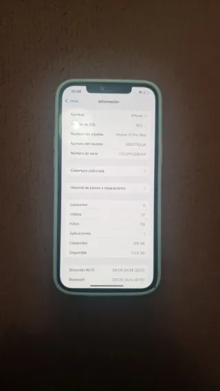 Telefono cellulare iPhone 12 Pro Max con 128GB di spazio di archiviazione. - Schermo Super Retina XDR. - Chip A14 Bionic. - Sistema di fotocamere Pro avanzato. - Retro in vetro opaco testurizzato e design in acciaio inossidabile. - Il telefono è ricondizionato. - Lo schermo è stato sostituito con uno compatibile di alta qualità. - Batteria originale (con messaggio) 86%. - Fotocamera originale (con messaggio). Telefono molto curato. - Con custodia, protezione, caricabatterie e cavo. - Scatola originale pronta per l'uso. - Libero e senza account. - Prezzi negoziabili.