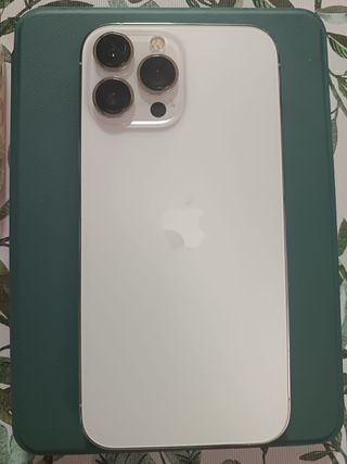 Telefono cellulare iPhone 13 Pro Max. - Schermo da 6,7 pollici. - Sistema a tripla fotocamera. - Connettività 5G. - Stato batteria 76% - Vetro posteriore rotto