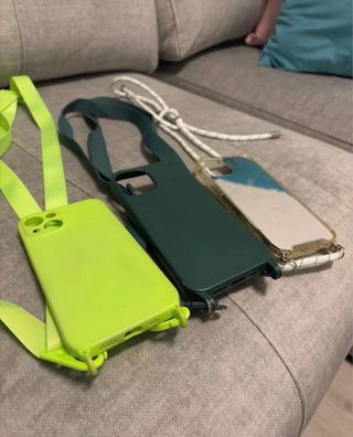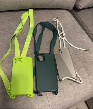 Set di tre custodie per iPhone, ciascuna con un cordone per il trasporto. - Custodia verde lime. - Custodia verde scuro. - Custodia trasparente a specchio.