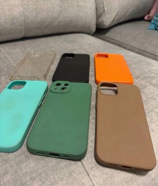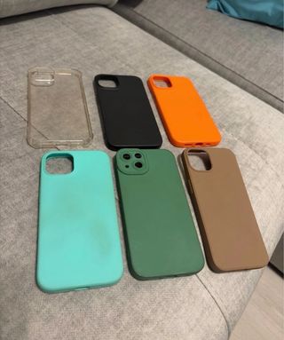 Set di cover per iPhone in diversi colori. - Cover trasparente - Cover nera - Cover arancione - Cover turchese - Cover verde - Cover marrone