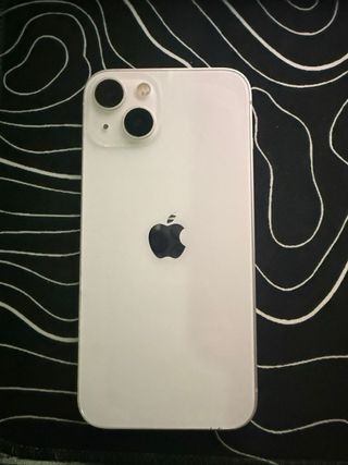 Telefono cellulare iPhone 13 con finitura bianca. Capacità di archiviazione di 128 GB. Doppia fotocamera posteriore.