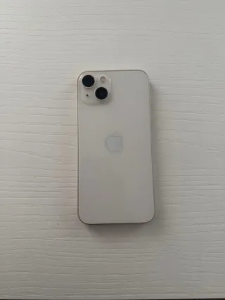 Telefono cellulare iPhone 13 con finitura bianca. Capacità di archiviazione di 128 GB. Doppia fotocamera posteriore.
