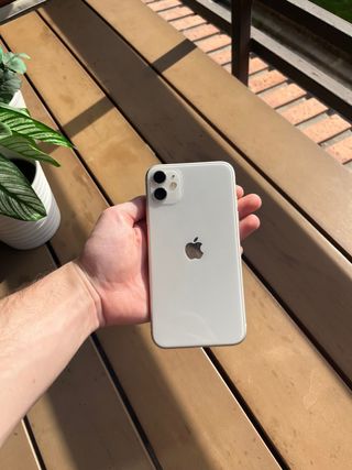 Telefono cellulare iPhone 11 in colore bianco. Presenta alcuni graffi sui lati. - Schermo da 6,1 pollici. - Fotocamera dual da 12 MP. - Chip A13 Bionic. Ha alcuni graffi sul retro e anche sul davanti ma ha una protezione, se la rimuovi lo schermo è in ottime condizioni quasi perfetto