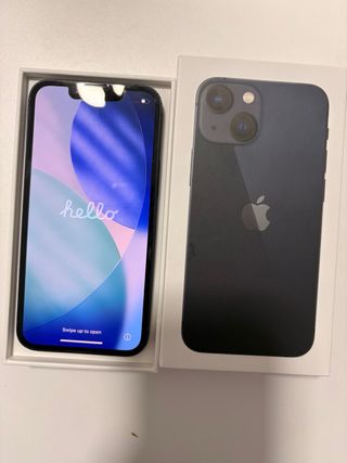 Telefono cellulare iPhone 13 mini con 128GB di spazio di archiviazione. Colore nero. Schermo Super Retina XDR. Include scatola, caricabatterie, protezione per lenti e custodia.