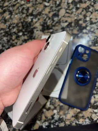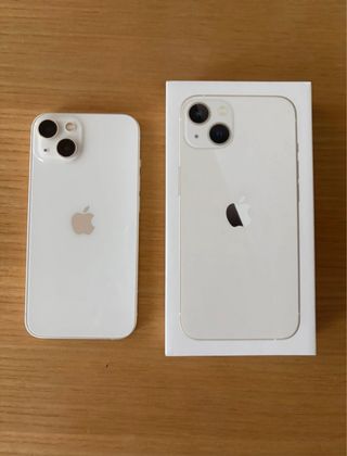 Telefono iPhone 13 mini in bianco. Include tre custodie e scatola originale. Piccolo graffio sulla fotocamera, ma le foto sono perfette. Batteria al 74%.