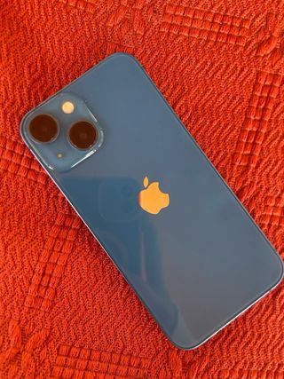 Telefono cellulare iPhone 13 mini in colore blu. - Schermo da 5,4 pollici. - Sistema di fotocamera dual avanzato. - Chip A15 Bionic. - Batteria al 74%. - Solo una piccola rottura sul retro, altrimenti perfetto senza problemi.