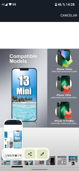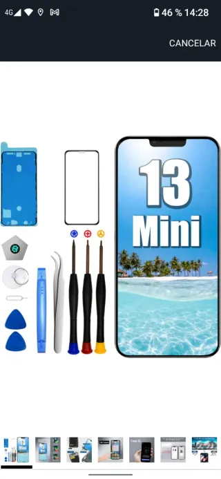 Ricambio dello schermo per iPhone 13 Mini, pronto per l'installazione. Include strumenti per il montaggio. - Schermo per iPhone 13 Mini. - Kit di strumenti per la riparazione. - Ventose. - Punta in plastica.