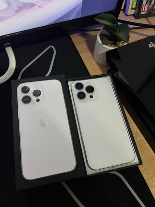 Telefono cellulare iPhone 13 Pro Max in colore argento. Capacità di 128 GB. Include confezione originale, fattura di acquisto, cavo originale e custodie.