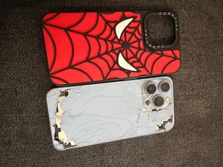 Telefono cellulare iPhone 13 Pro Max in colore argento. È caduto dal terzo piano. Si può ancora recuperare qualcosa per i pezzi.