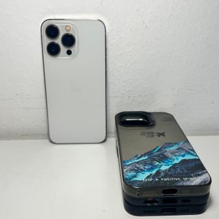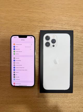 Telefono cellulare iPhone 13 Pro Max in bianco. Include scatola originale e accessori. - Cover protettive incluse. - Cavo di ricarica.